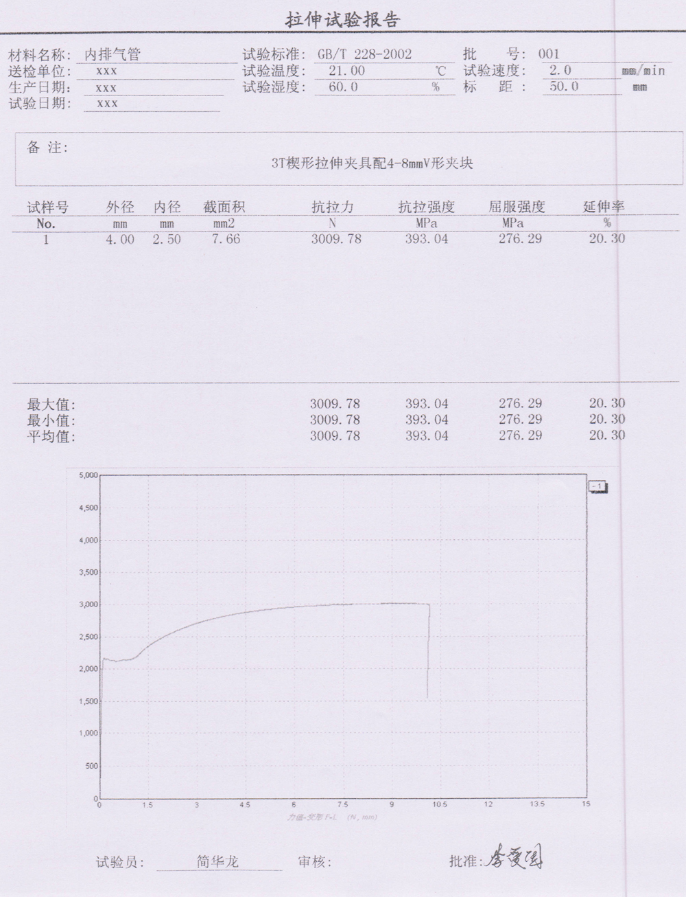 楔形拉伸夾具。實(shí)驗(yàn)步驟選用3T楔形拉伸夾具配4~8mm V形夾塊,夾持試樣上端并清零,移動(dòng)橫梁到適當(dāng)位置夾持試樣下端,用微動(dòng)控制橫梁卸力到0~1N,并位移清零,出試驗(yàn)報(bào)告。最后報(bào)告內(nèi)容是尺寸、截面移、抗拉力、抗拉強(qiáng)度、屈服強(qiáng)度、延伸率。