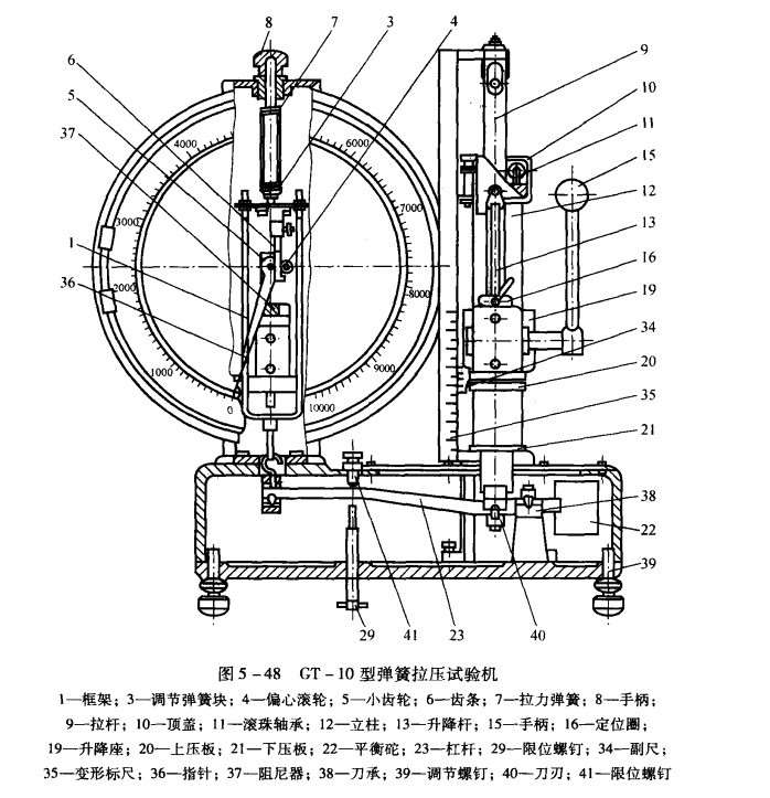 加荷是由板動(dòng)手把15使上壓板20下降,當(dāng)下壓板21受力后,傳至杠桿23。杠桿23左端下沉,負(fù)荷傳至拉力彈簧7,彈簧變形伸長(zhǎng),使框架(帶齒條6)向下移動(dòng),指針即在度盤上指出相應(yīng)的負(fù)荷,而彈簧變形量則從變形標(biāo)尺35及副及34上讀出。