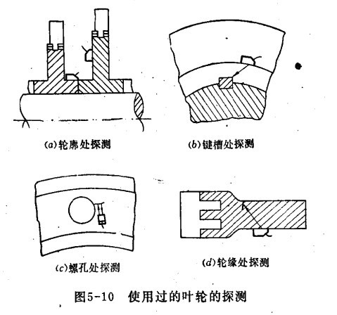 使用過的葉輪,主要是發(fā)現(xiàn)疲勞裂紋。因此探傷儀探測區(qū)域應(yīng)選擇承受應(yīng)力最大的部位,如輪殼,鍵槽,螺紋孔以及輪面與輪緣的過渡區(qū)域的截面等,如下圖示,用斜探頭在輪殼外圓上探測時,可發(fā)現(xiàn)輪殼內(nèi)的徑向缺陷和鍵槽處的缺陷。當(dāng)探頭主聲束射至鍵槽時,則出現(xiàn)強(qiáng)烈的鍵槽反射波,找到鍵槽反射波后,將探頭繼續(xù)向前移動,若在鍵槽反射波的附近出現(xiàn)反射波時,則鍵槽處存在裂紋。