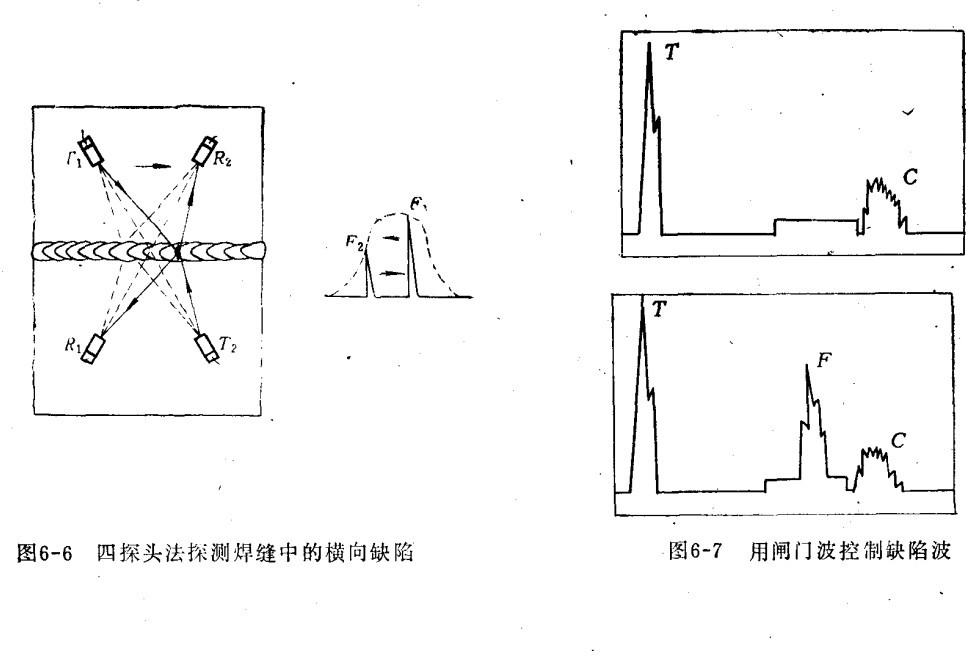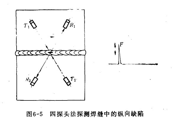 (二)四探頭法 四探頭法可探測厚度為4~12毫米的薄板對接焊縫中的裂紋、未焊透、條狀夾渣等缺陷。而且還可以進行探傷儀自動探測。四探頭法為兩組探頭(T為發(fā)射探頭,R為接收探頭),用機械固定并分別放在焊縫兩側(cè)(距焊縫軸線距離相等),探傷時沿焊縫同時移動。探測縱向缺陷時,T1R1為一組探頭,T2R2為一組當焊縫中無缺陷時,熒光屏上只出現(xiàn)焊角反射波。如有缺陷,則在焊角反射波之前出現(xiàn)缺陷波F(如缺陷在焊縫中間,則兩組探頭所得缺陷波重疊在一起),探頭移動時,缺陷波的幅度改變。