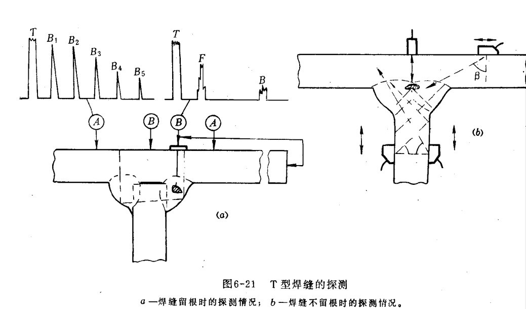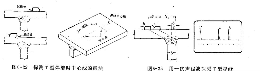 一、T型焊縫探傷 T型焊縫探傷有兩種形式:其一為面板與腹板鏈接處的中間部分不需要焊透,只在兩角處焊接。其二為面板與腹板連接處全部焊透,這兩種焊縫分別可用直探頭及斜探頭探傷。
