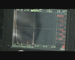 3.先將探頭發(fā)在被測件表面,觀察底波出現(xiàn)的位置、幅度及形狀 可以注意到,如果在探頭發(fā)射的超聲波傳遞路徑上,如果沒有缺陷,則在底波和始脈沖(時間零點(diǎn))之間應(yīng)該沒有獨(dú)立信號出現(xiàn)。