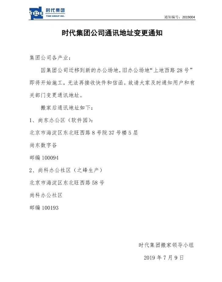 時代集團(tuán)公司通訊地址變更通知